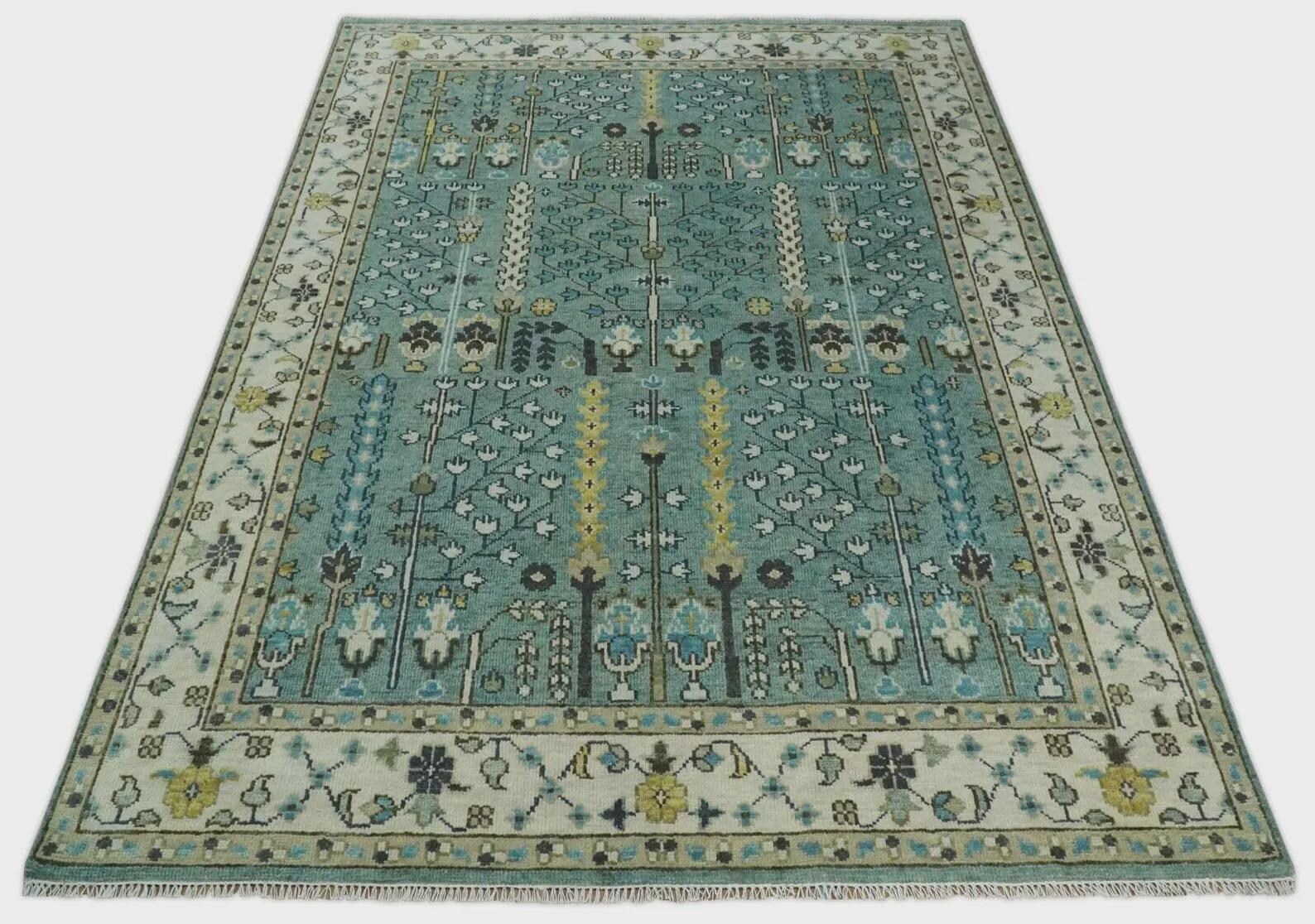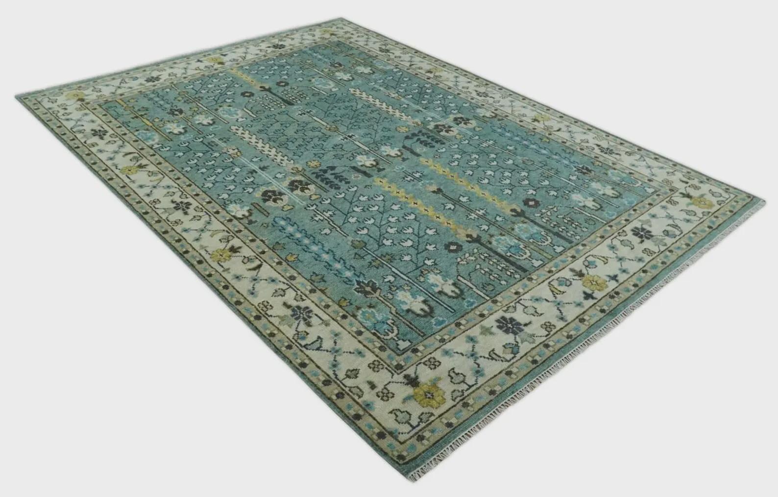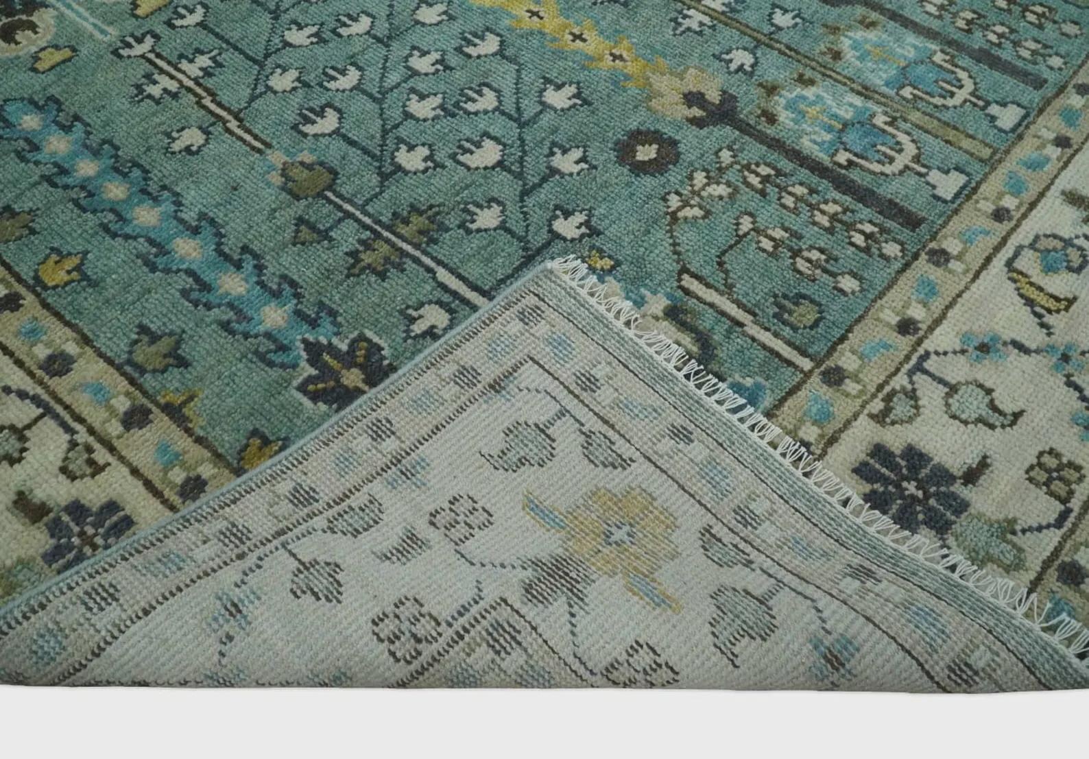 Hand Knotted Floral Wool Area Rug Blue Green Traditional Carpet