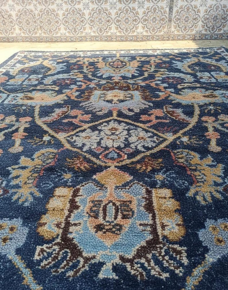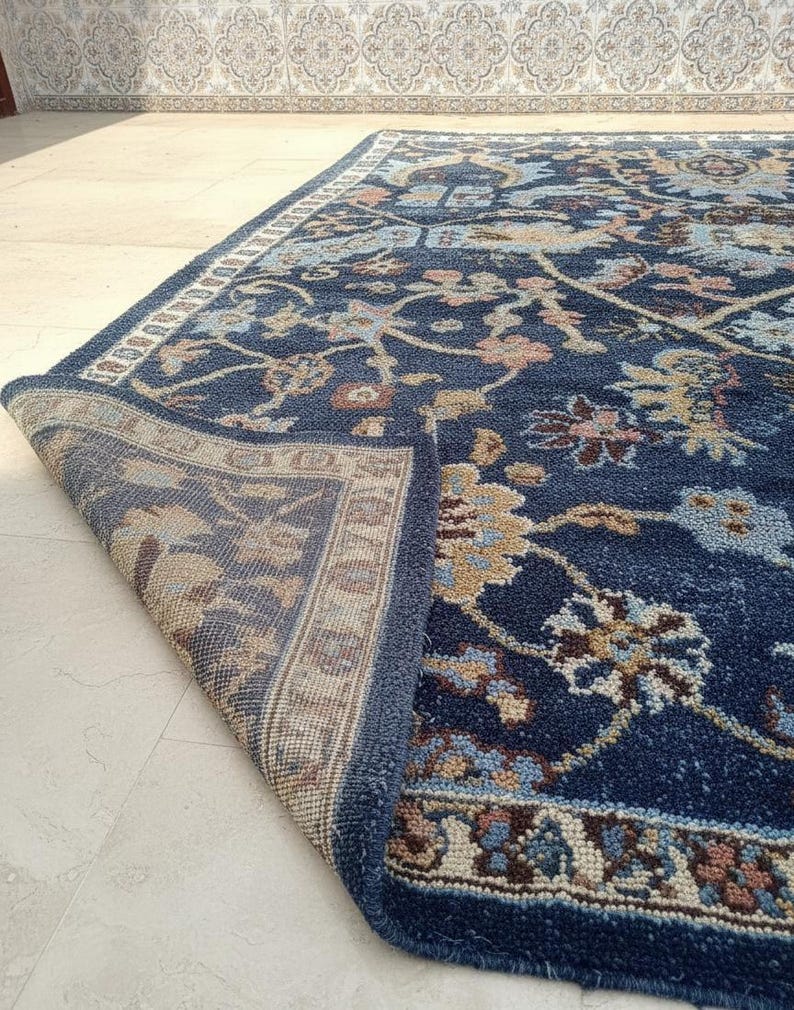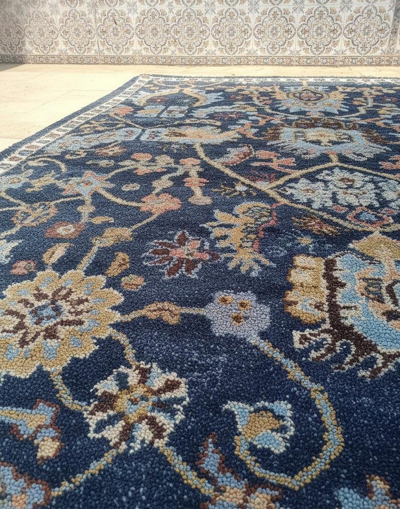 Bring timeless elegance into your space with this hand-knotted wool rug, crafted by skilled artisans using traditional techniques passed down through generations. Featuring a deep navy blue base adorned with intricate medallion and floral motifs in warm ivory, gold, and earthy tones, this rug makes a striking statement in any interior.