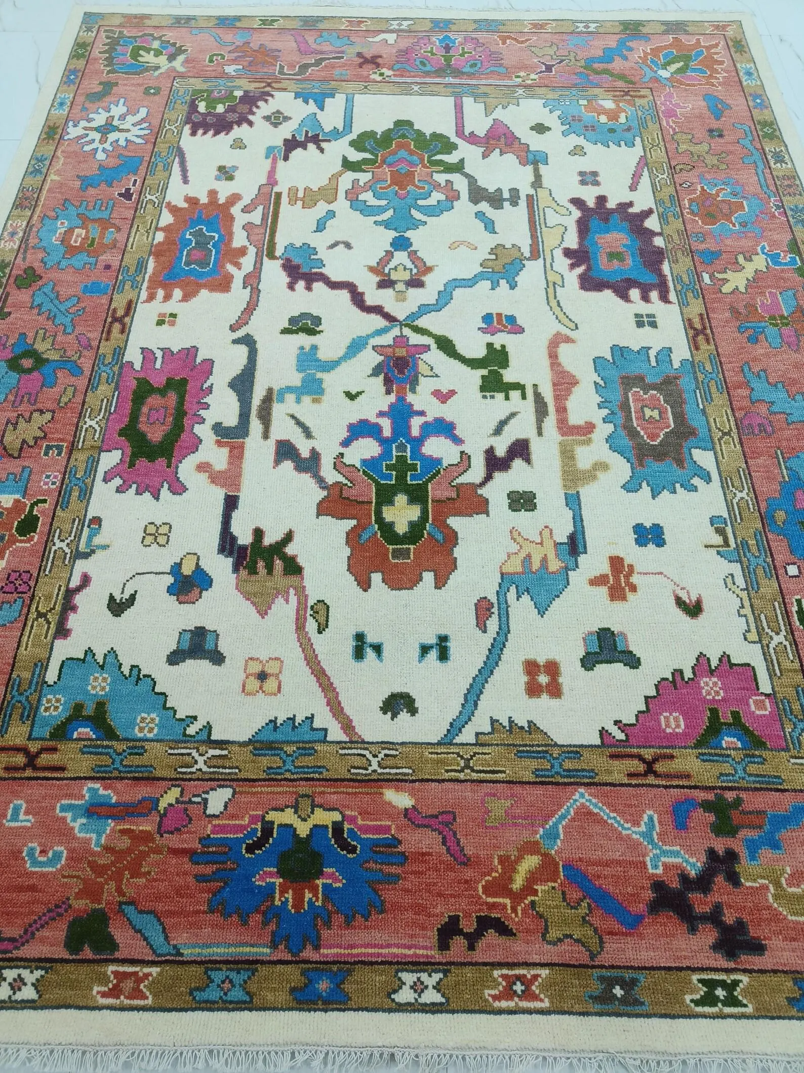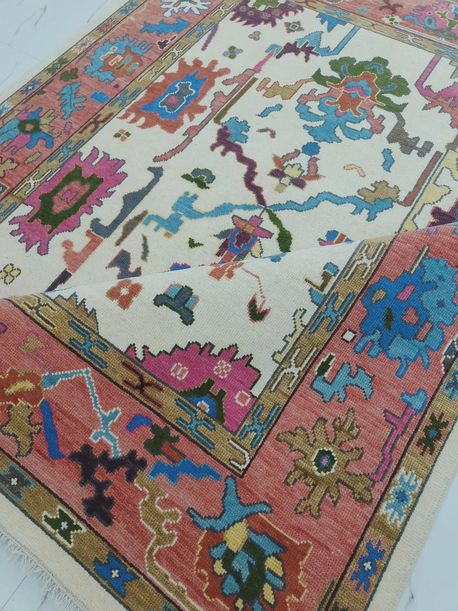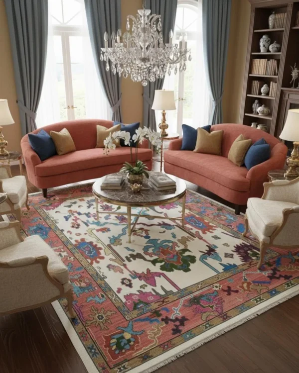 The harmonious blend of coral, teal, ivory, mustard, blue, green, and earthy tones creates a versatile palette that complements luxury living rooms, formal seating areas, bedrooms, and curated designer spaces. Each rug is meticulously handcrafted by skilled artisan weavers, using traditional hand-knotting techniques passed down through generations.